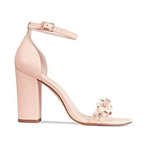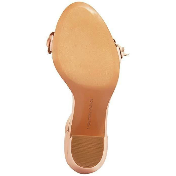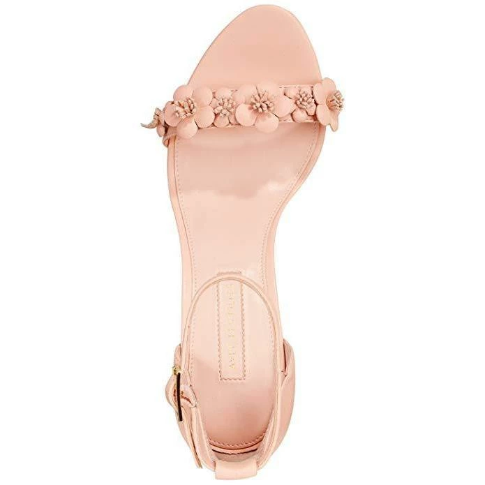 - Adjustable buckle closure at ankle strap; floral embellishment at toe cap
