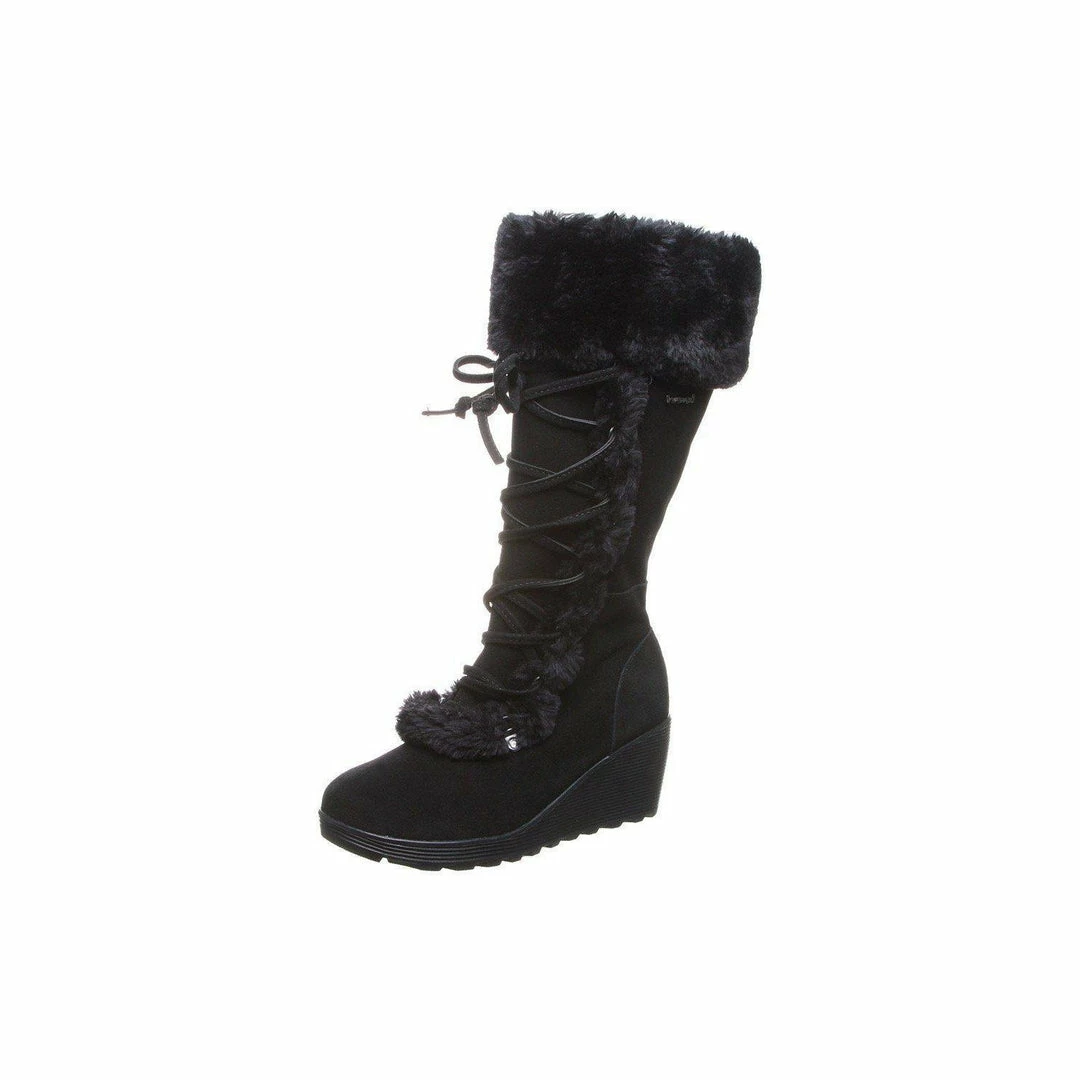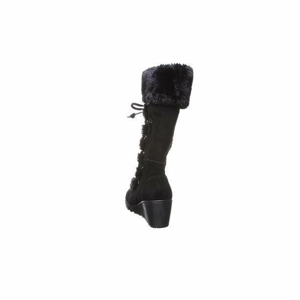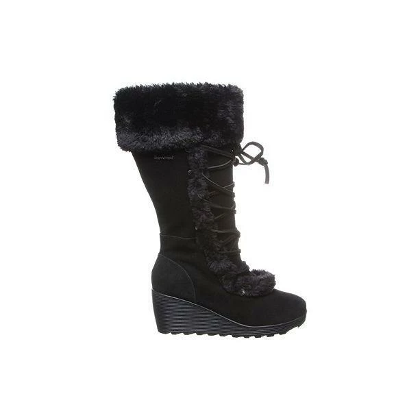 12″ Tall cow suede boot with front lace detail and faux fur collar trim. Zipper on inside leg for quick and easy on/off. Treated with NeverWet® technology for extra protection from the elements. Wool blend lining made from polyester. Sheepskin comfort footbed on a molded TPR wedge heel outsole.