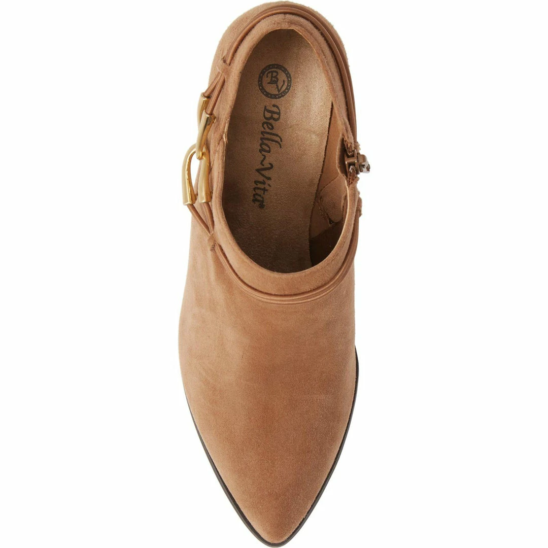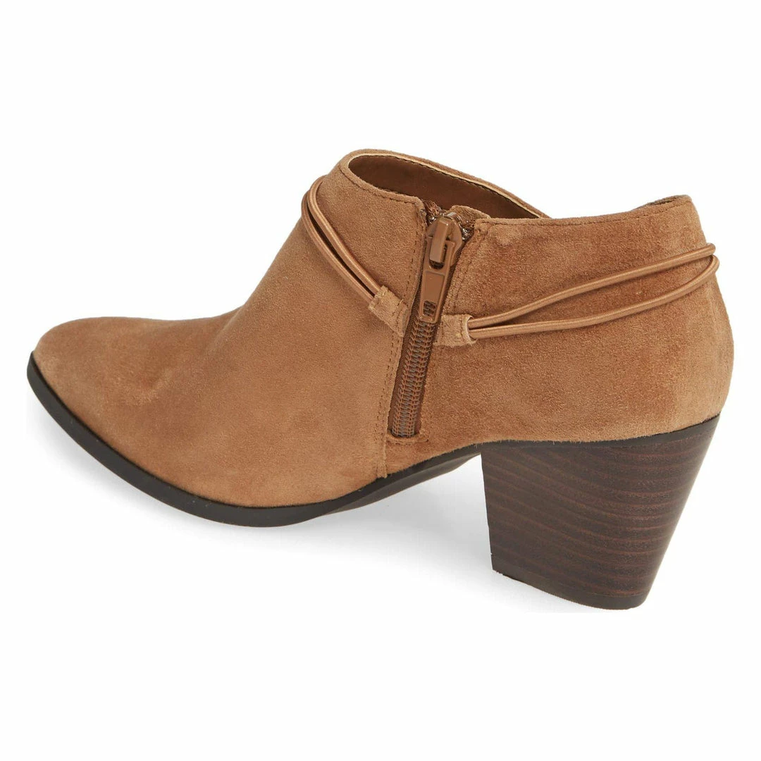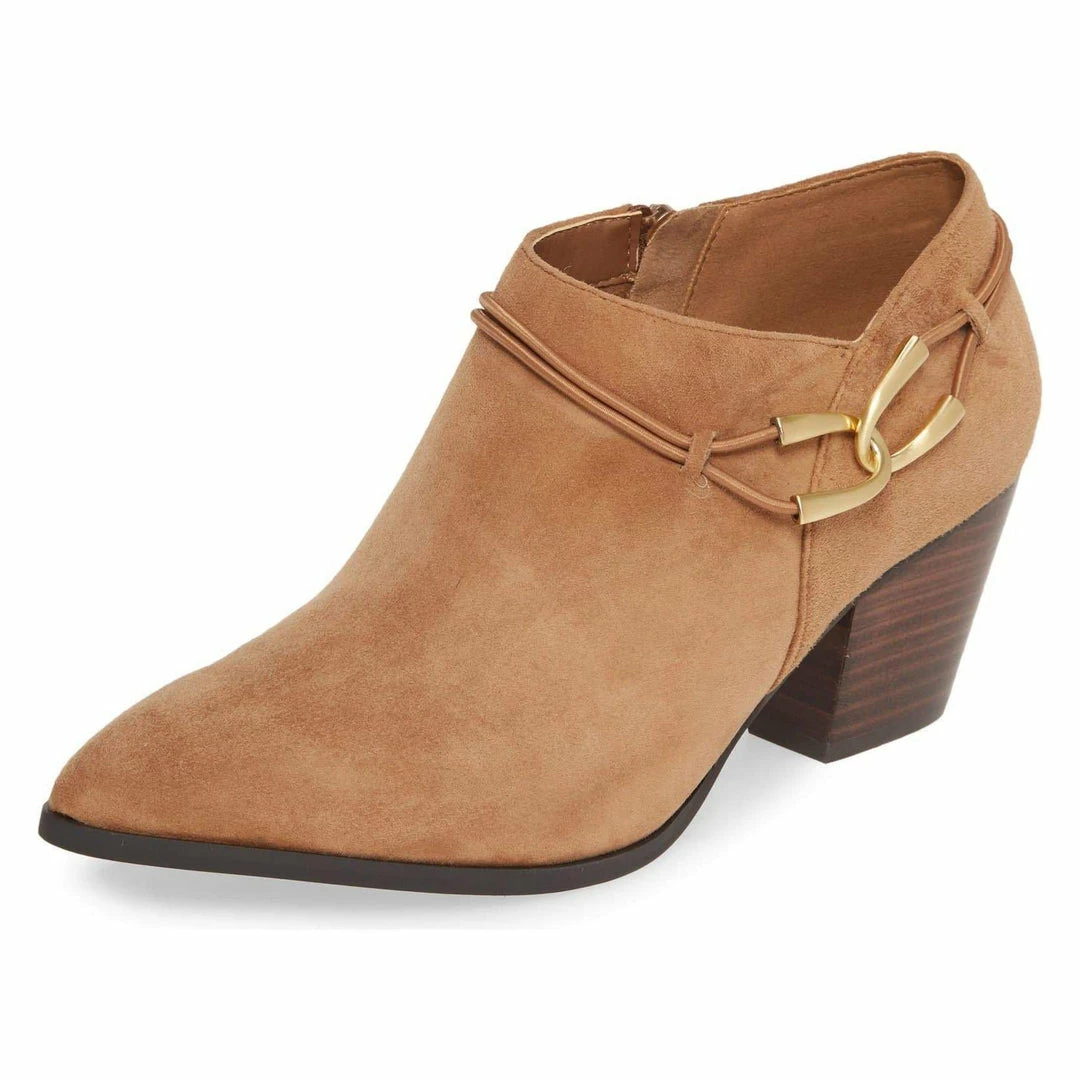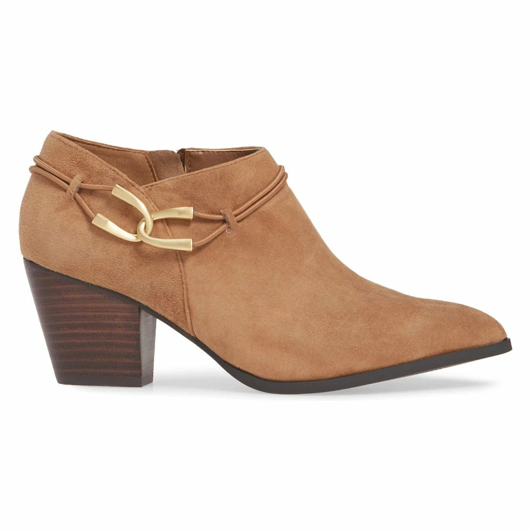 Gleaming hardware links the straps at the ankle of this contemporary bootie with a Western-inspired silhouette and stacked heel.