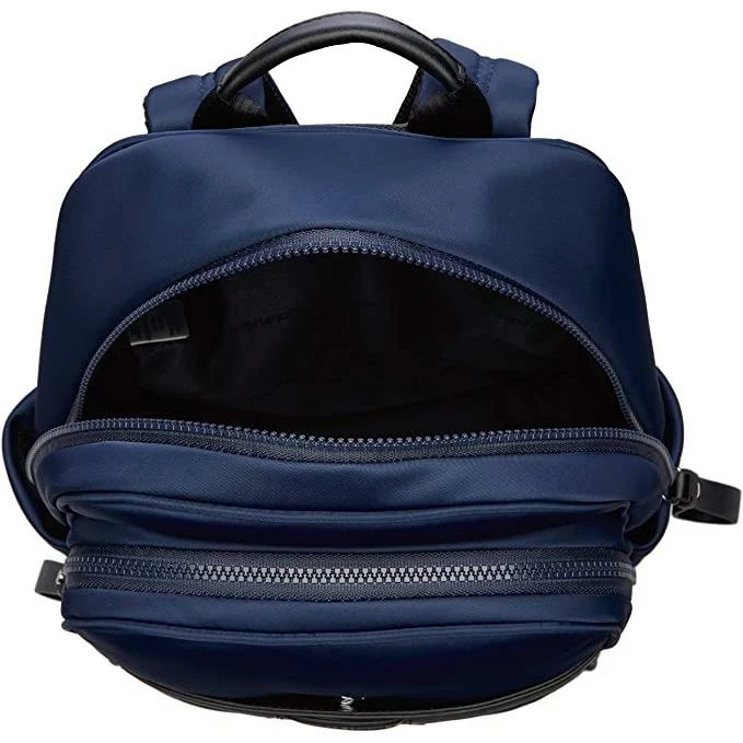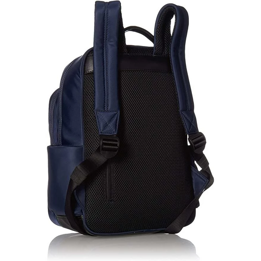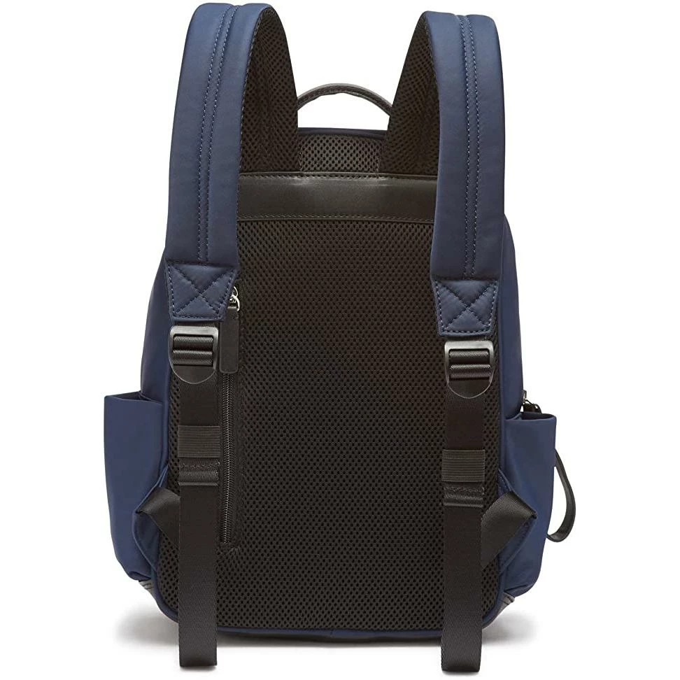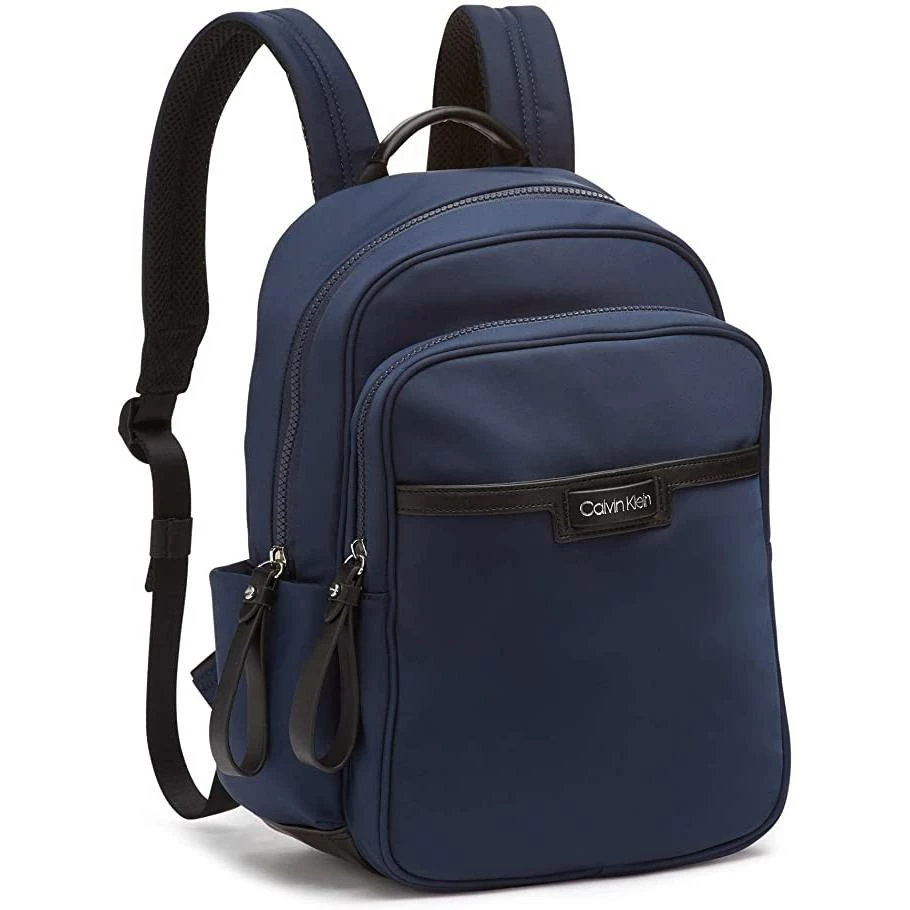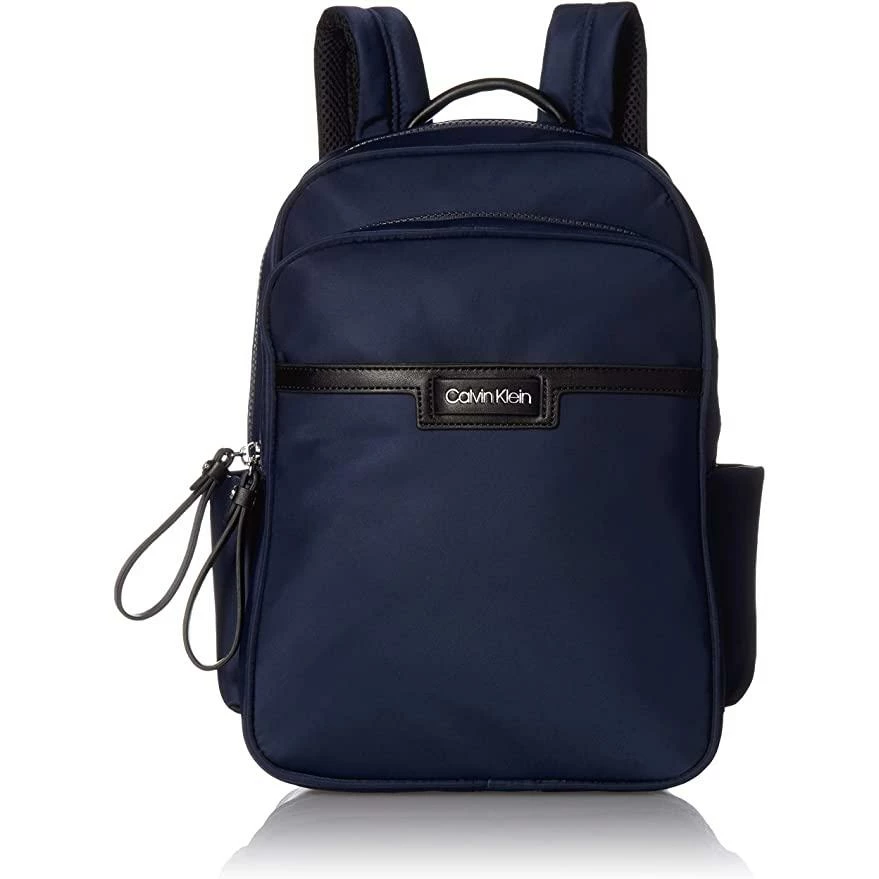 Sleek faux leather frames a lightweight nylon Calvin Klein backpack meant for stylish carry here, there and everywhere.