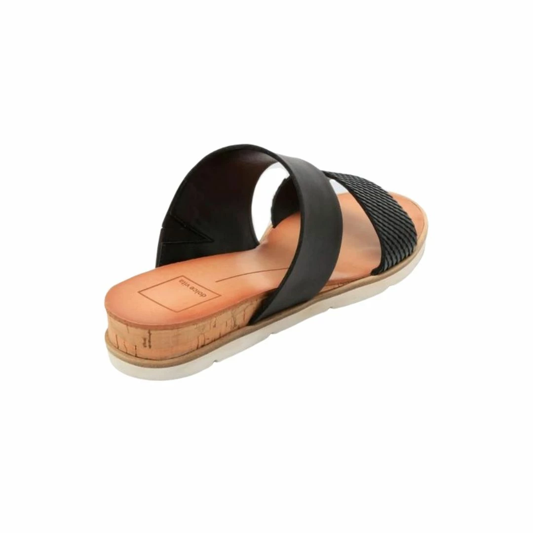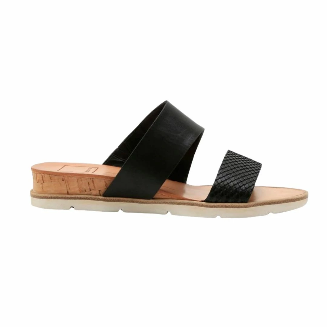 Double-band slide sandal has spotted cow hair band and plain leather band on a cork wedge sole.