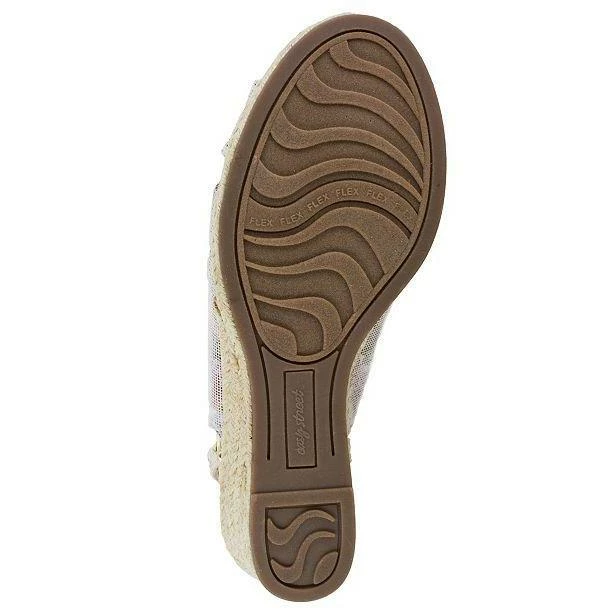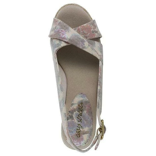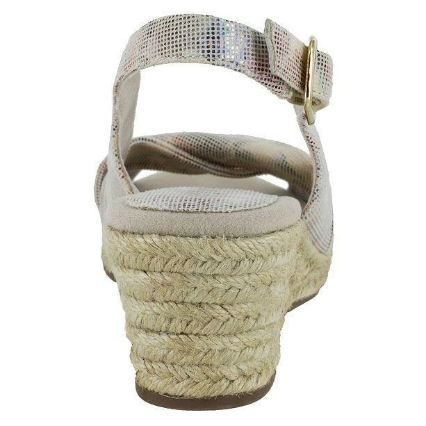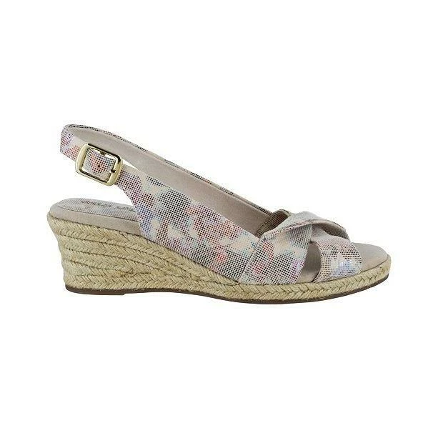 The Maureen by Easy Street features a folded over vamp design that adds a fresh, modern look to your slingback summertime sandal. The adjustable buckle has hidden gore for a tailored fit. Padded comfort, lightweight and flexibility abound which are complete on a classic espadrille wedge.