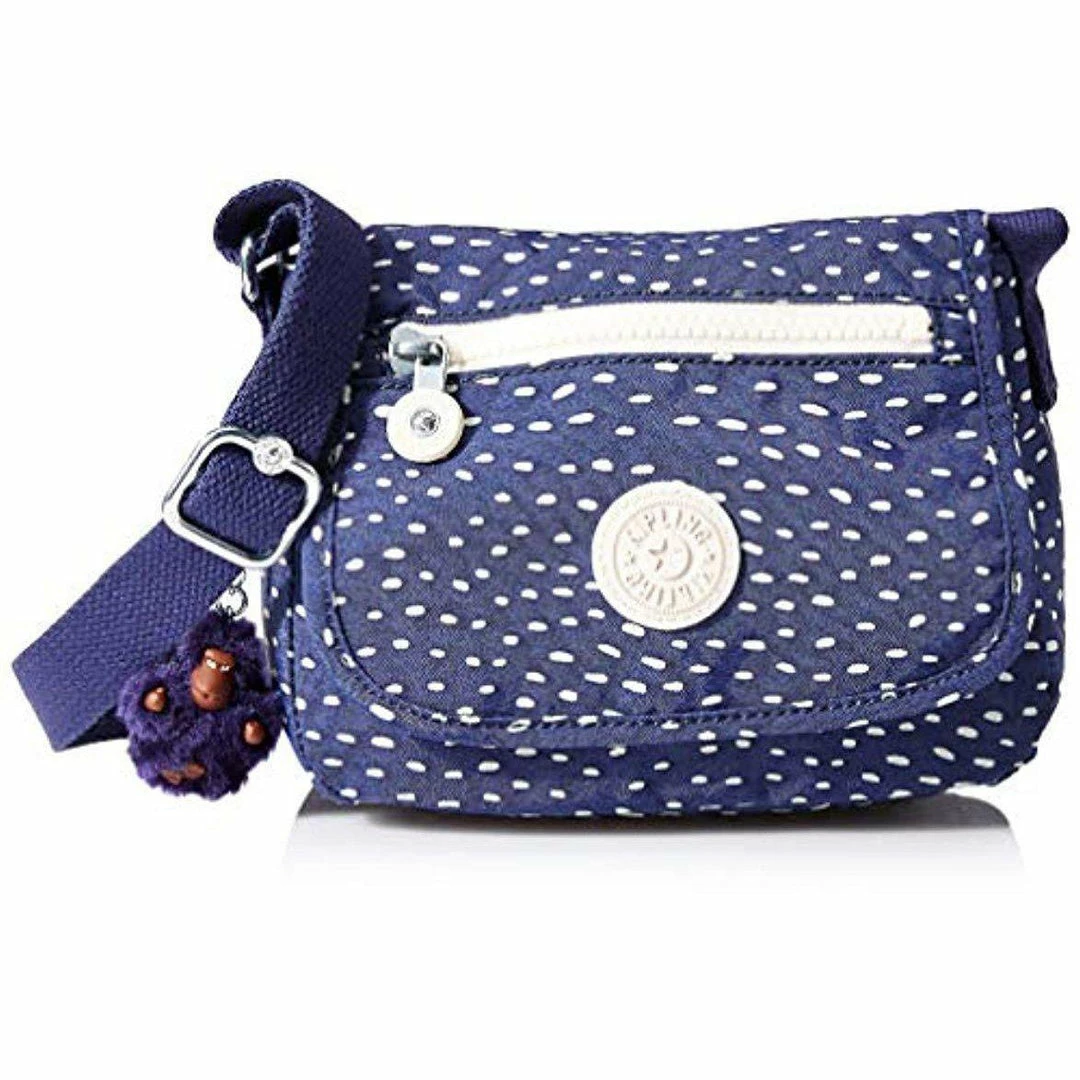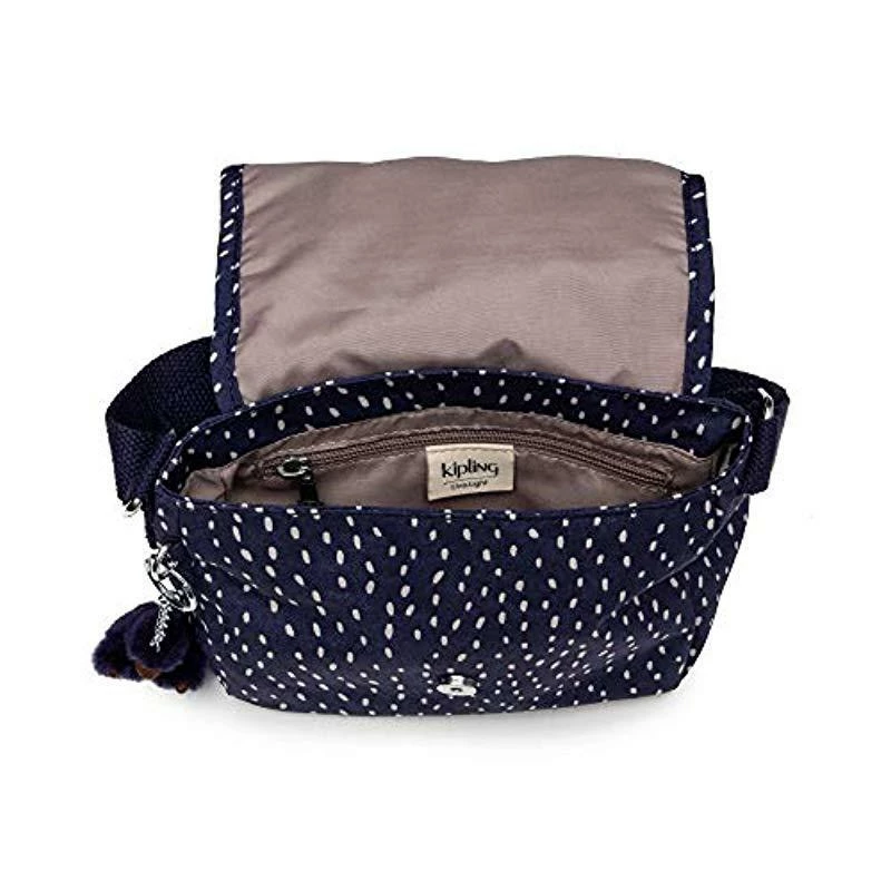 Durable, flexible nylon comprises a Kipling mini crossbody designed to hang at the hip for on-the-go access without added bulk.