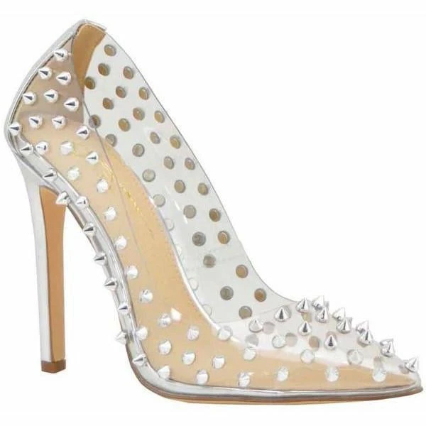 Spiky studs add rocker-chic attitude to a pointy-toe pump lifted by a stiletto heel.