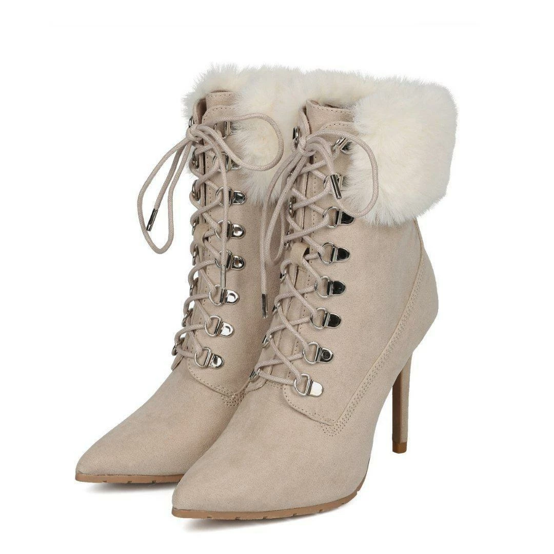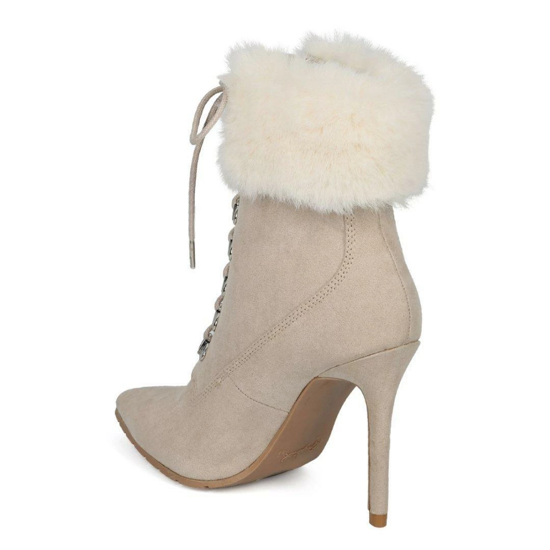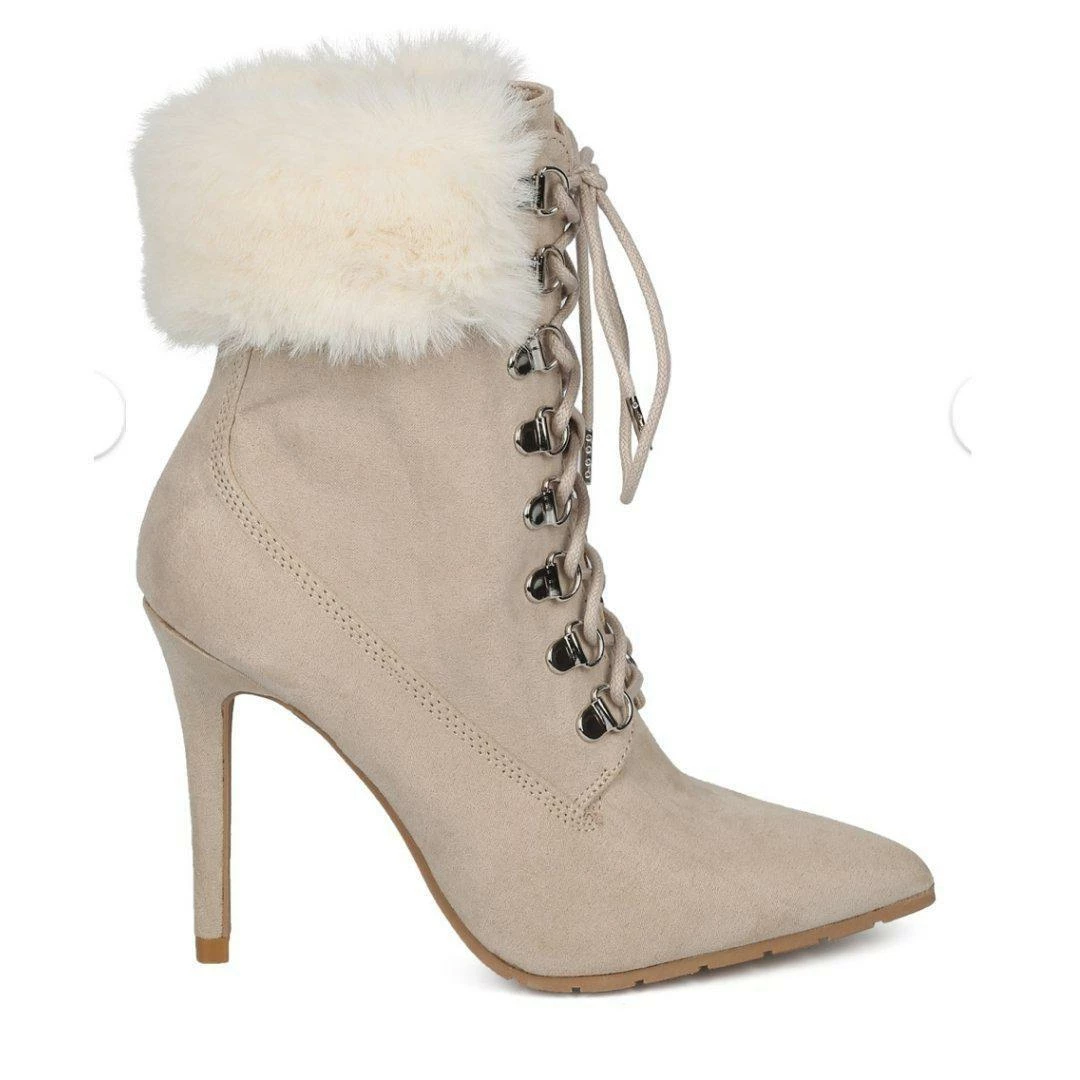 These sexy booties are made with a faux suede upper, pointy toe and lace up front. Also made with a single sole, stiletto heel and faux fur collar.