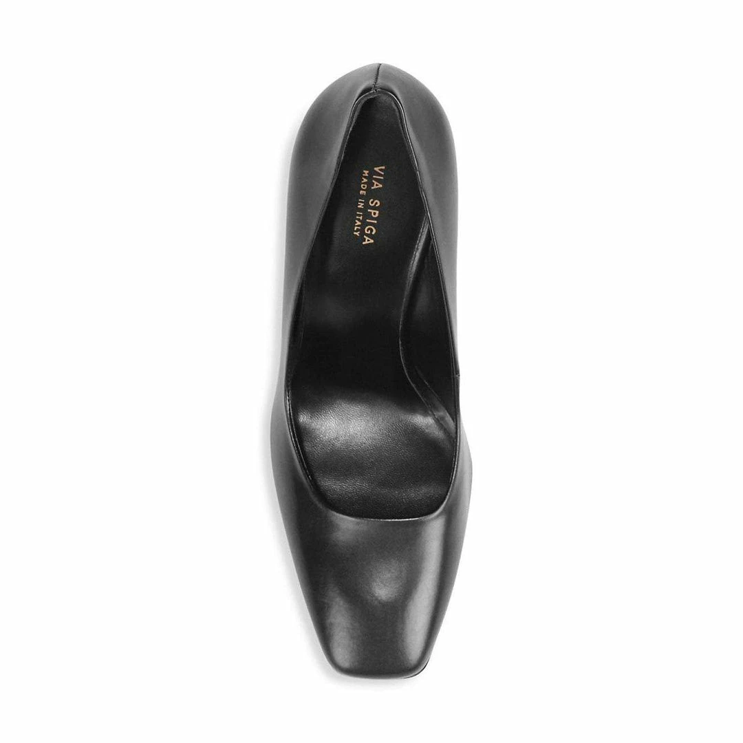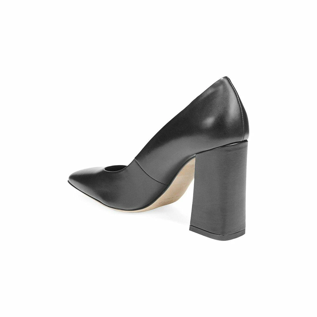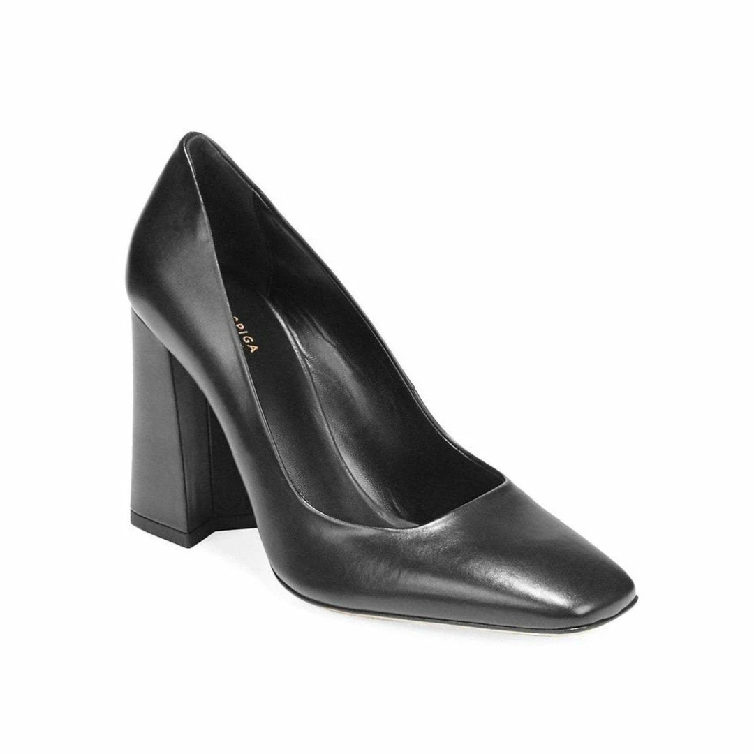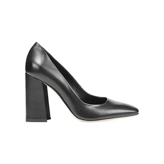 Shapely squared-toe pumps set on a daring stacked heel for a bold look.