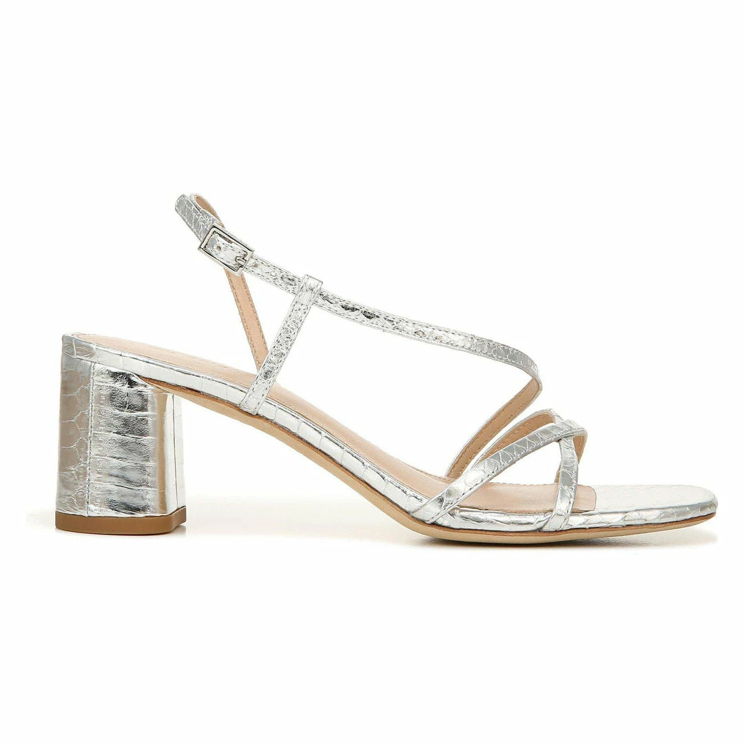 Slender straps add lithe style to a shimmering sandal lifted by a column heel.